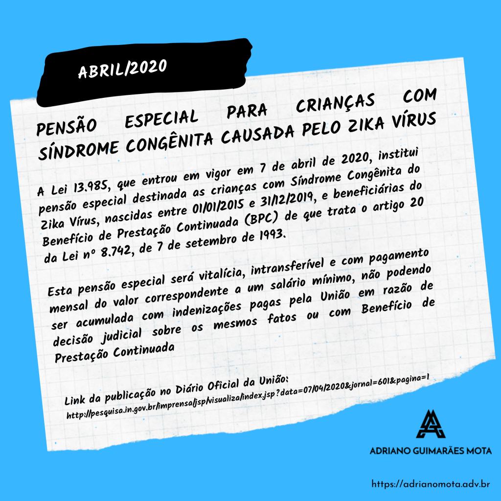 A Lei nº 13.985, de 7 de abril de 2020, institui pensão especial destinada as crianças com Síndrome Congênita do Zika Vírus, nascidas entre 01/01/2015 e 31/12/2019, e beneficiárias do Benefício de Prestação Continuada (BPC) de que trata o artigo 20 da Lei nº 8.742, de 7 de setembro de 1993.